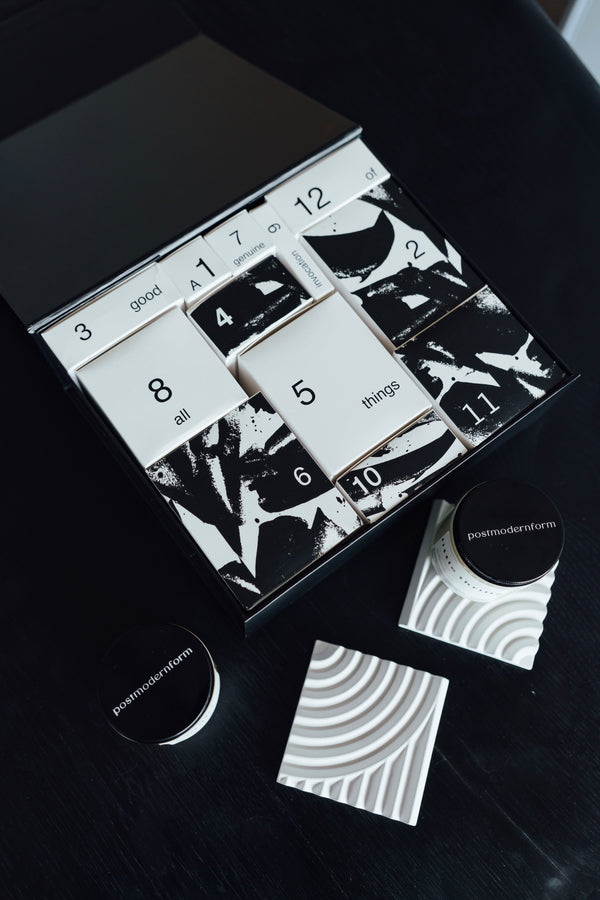 The ultimate postmodernform gift, this 12-piece advent calendar contains 12 unique postmodernform items, including limited edition full-size and discovery-sized candles, various concrete pieces, and complementary decor items to delight the most discerning of giftees. Contents valued at over $170.